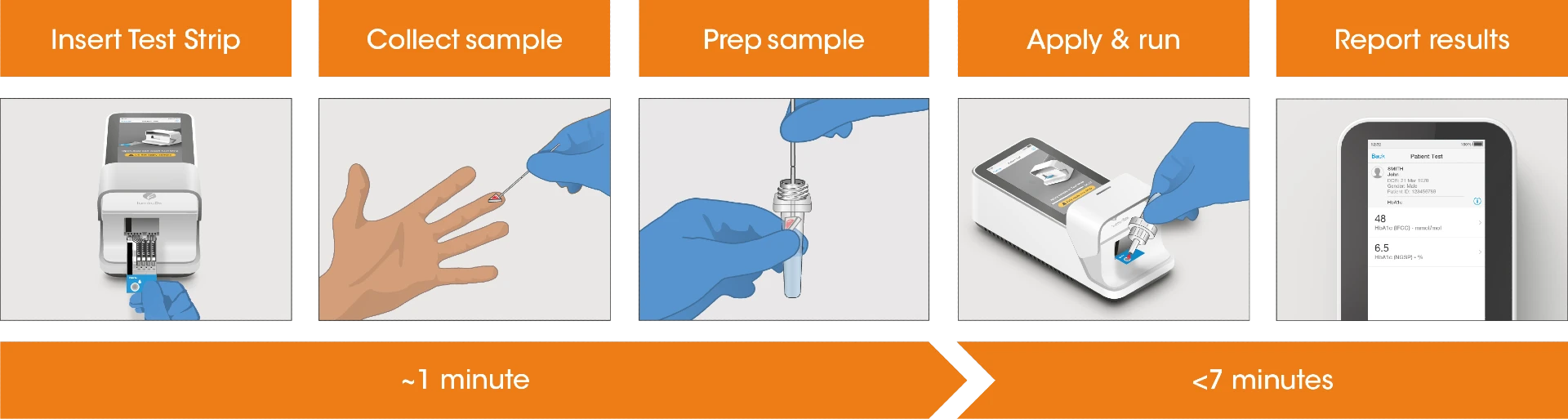 The workflow process is comprised of a simple sample collection with a fingerstick lancet followed by step-by-step guidance of the Instrument to report a patient result in <7 minutes from sample application.
